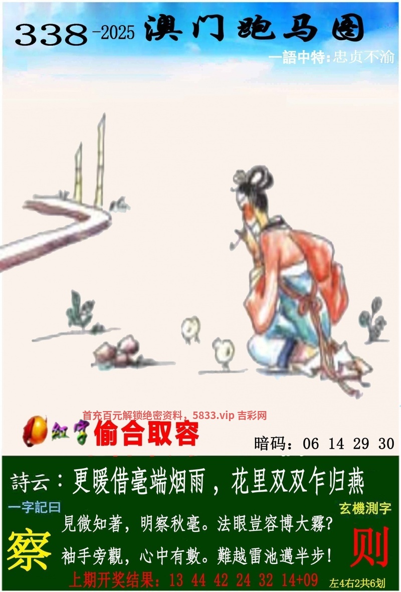 | 338期:一字記曰【察】 見微知著,明察秋毫。法眼豈容博大霧?袖手旁觀,心中有數。難越雷池邁半步!【则】 解:花里双双乍归燕:花里双双解双肖虎狗马猴鼠龙 生肖:虎狗马猴鼠龙 |
